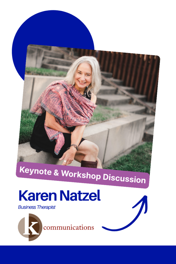 - 7:15pm: Presentation and Peer-led content led by Karen Natzel, Business Therapist at K Communications